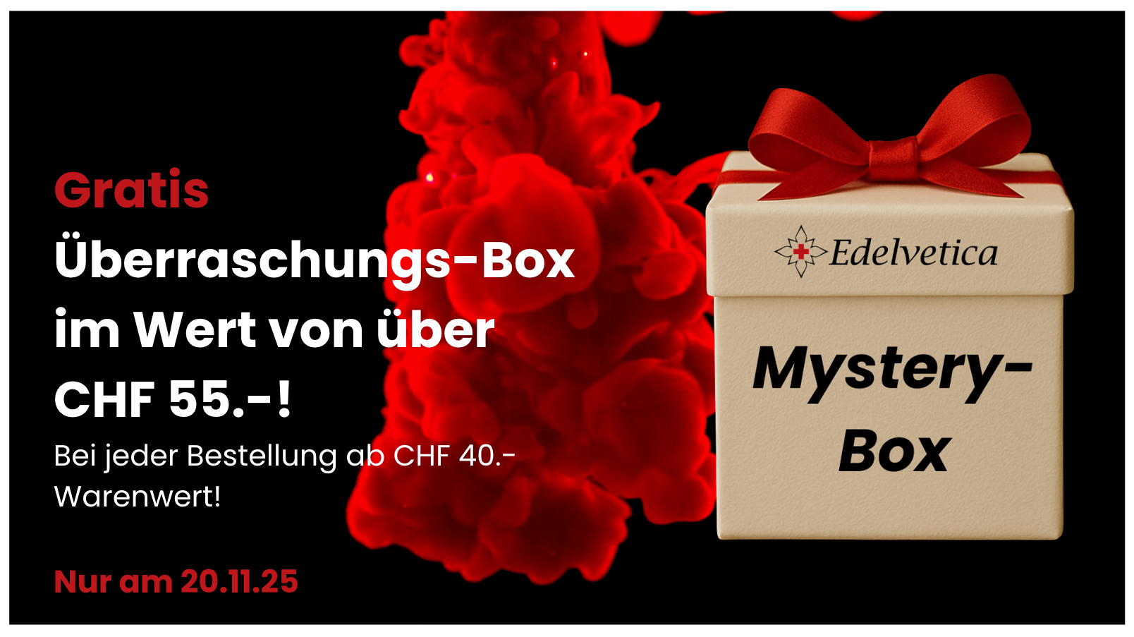 *Die Edelvetica-Mystery-Box. Gibts Gratis zu jedem Warenkorb-Wert ab 40 CHF. Aber nur am 20.11.25.
