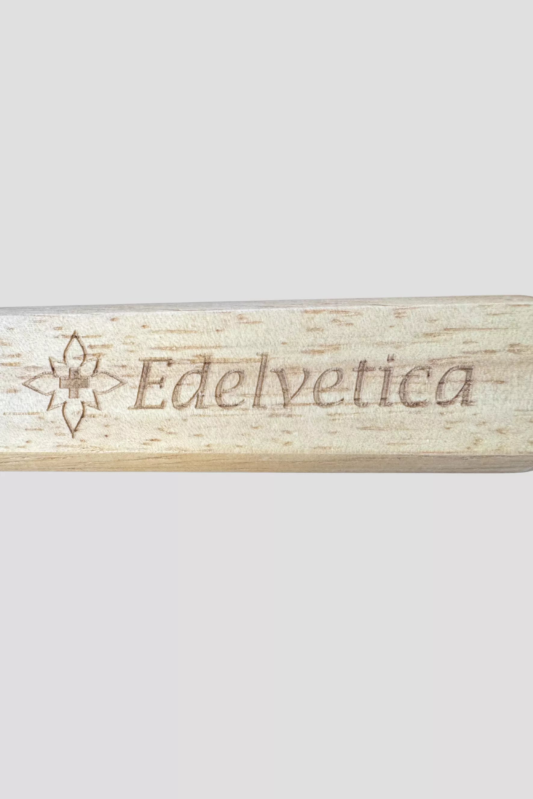 Dieser Flaschenöffner verbindet robustes Metall mit einem natürlichen Holzgriff – ergänzt durch die präzise eingravierte Edelvetica-Signatur.